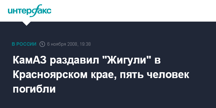 Москва. 6 ноября. INTERFAX.RU - КамАЗ и легковой автомобиль столкнулись на трассе Красноярск-Енисейск в Красноярском крае, погибли пять человек.