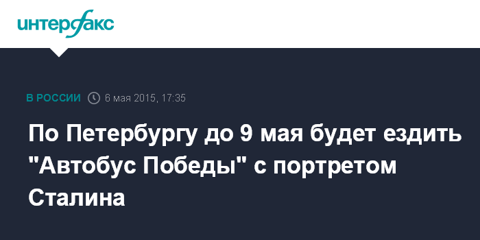 Москва. 6 мая. INTERFAX.RU - Акция "Автобус Победы", в ходе которой по Петербургу будет курсировать автобус с изображением верховного главнокомандующего СССР Иосифа Сталина, стартовала в среду и продлится по 9 мая, сообщила "Интерфаксу" член горкома КПРФ Ольга Ходунова в среду.