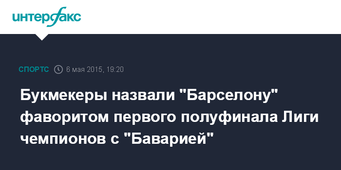 Москва. 6 мая. INTERFAX.RU - Каталонская "Барселона" является фаворитом первого полуфинального матча Лиги чемпионов УЕФА против мюнхенской "Баварии", свидетельствуют котировки британской букмекерской конторы William Hill.