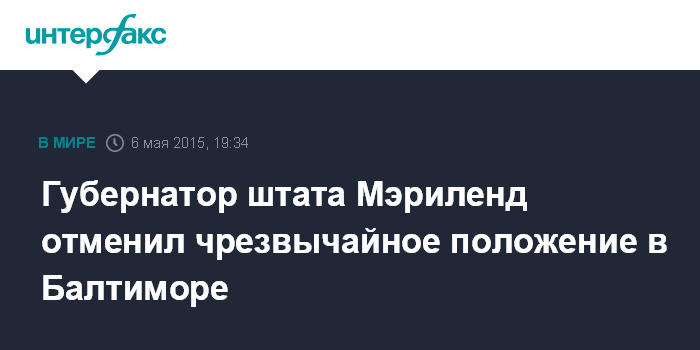 Москва. 6 мая. INTERFAX.RU - Губернатор американского штата Мэриленд Ларри Хоган объявил о прекращении режима чрезвычайного положения в Балтиморе, введенного после начала беспорядков в этом городе, сообщает в среду агентство Associated Press.