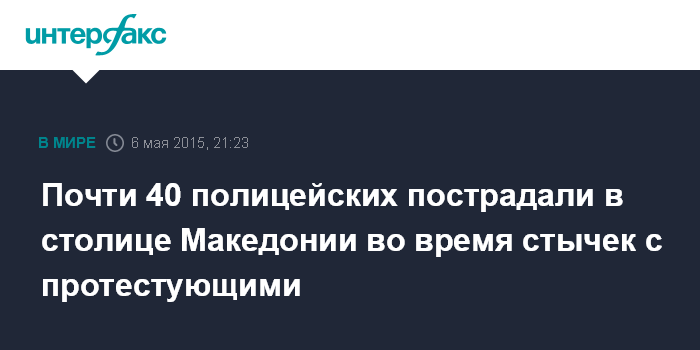 Москва. 6 мая. INTERFAX.RU - Тридцать девять человек, из которых 38 - сотрудники полиции, получили ранения в столице Македонии Скопье в ходе антиправительственных беспорядков, сообщает в среду агентство Associated Press.