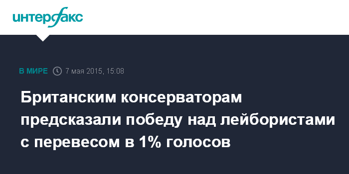 Москва. 7 мая. INTERFAX.RU - За Консервативную партию Великобритании готовы проголосовать 36% избирателей, в то время как за лейбористов - 35%, свидетельствуют результаты опроса, проведенного институтом Ipsos Mori непосредственно перед началом выборов.