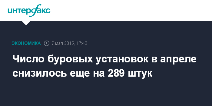 Москва. 7 мая. INTERFAX.RU – Число буровых установок для добычи нефти и газа в мире в апреле 2015 года составило 2 тыс. 557 штук, что на 289 установок меньше, чем в марте 2015 года, сообщила нефтесервисная Baker Hughes.