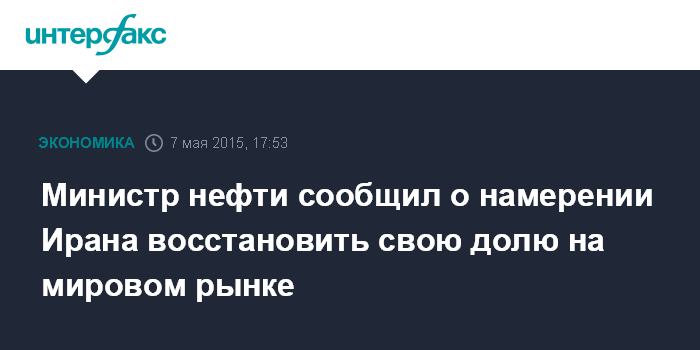 Москва. 7 мая. INTERFAX.RU – Иран намерен восстановить свою долю на мировом нефтяном рынке после снятия международных санкций в результате достижения итоговых договоренностей по ядерной программе страны, сообщает общеарабская газета Al-Quds со ссылкой на министра нефти Ирана Биджана Намдара Зангане.