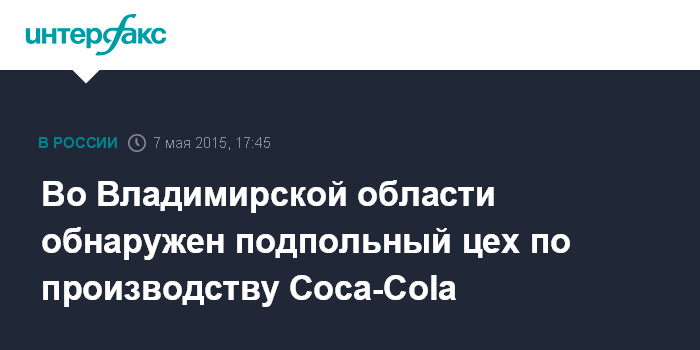 Москва. 7 мая. INTERFAX.RU - Полиция обнаружила в городе Судогде Владимирской области подпольный цех по производству контрафактного безалкогольного напитка под брендом Coca-Cola, сообщил "Интерфаксу" источник в УМВД России по региону.