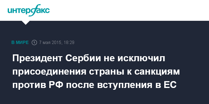 Москва. 7 мая. INTERFAX.RU - Президент Сербии Томислав Николич в эксклюзивном интервью "Интерфаксу" подтвердил несогласие Белграда с антироссийскими санкциями ЕС, однако отметил, что Сербия после присоединения к Евросоюзу будет обязана следовать общей политике этой организации.