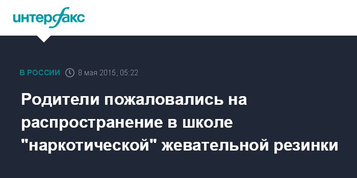 Москва. 8 мая. INTERFAX.RU - Около десятка родителей учеников второго класса одной из школ Владивостока обратились с заявлением в наркоконтроль в связи с распространением среди детей "наркотической" жевательной резинки и драже. Об этом говорится в заявлении, поступившем в "Интерфакс".