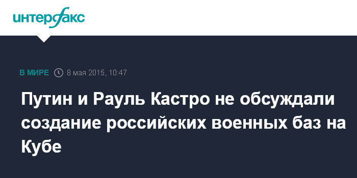 Москва. 8 мая. INTERFAX.RU - Президент России Владимир Путин и глава правительства Кубы Рауль Кастро не обсуждали вопрос об открытии российских военных баз на Кубе в ходе своей встречи в Москве, сообщил журналистам пресс-секретарь главы российского государства Дмитрий Песков.