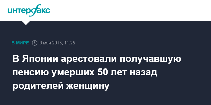 Москва. 8 мая. INTERFAX.RU - Полиция Японии арестовала 86-летнюю Мицуэ Судзуки по обвинению в том, что она не сообщила в пенсионные учреждения факт смерти своих родителей в 1960-е годы и продолжала получать за них пенсию, сообщает в пятницу британское издании The Daily Mail.