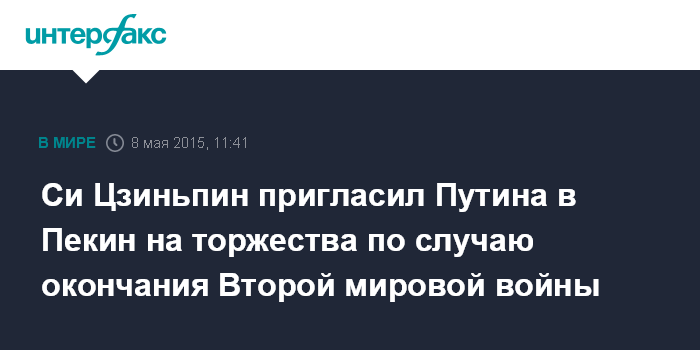 Москва. 8 мая. INTERFAX.RU - Председатель КНР Си Цзиньпин пригласил президента России Владимира Путина посетить Китай 3 сентября для участия в торжественных мероприятиях в честь 70-летия окончания Второй мировой войны.
