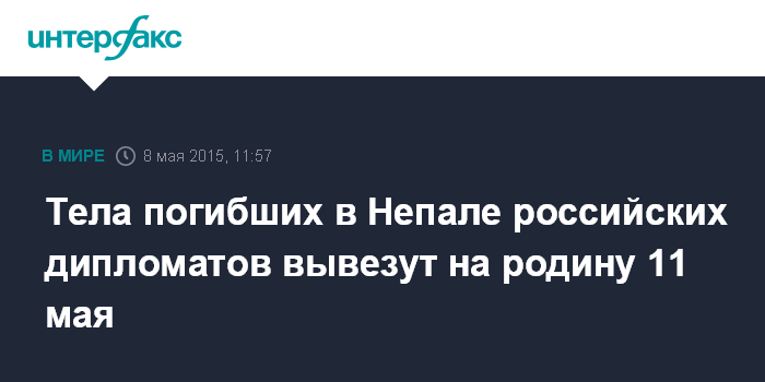 Москва. 8 мая. INTERFAX.RU - Самолет МЧС РФ доставит 11 мая из Непала в Россию тела двух погибших при землетрясении российских дипломатов, сотрудников посольства РФ в Пакистане, сообщил замдиректора Департамента международной деятельности МЧС Александр Томашов.
