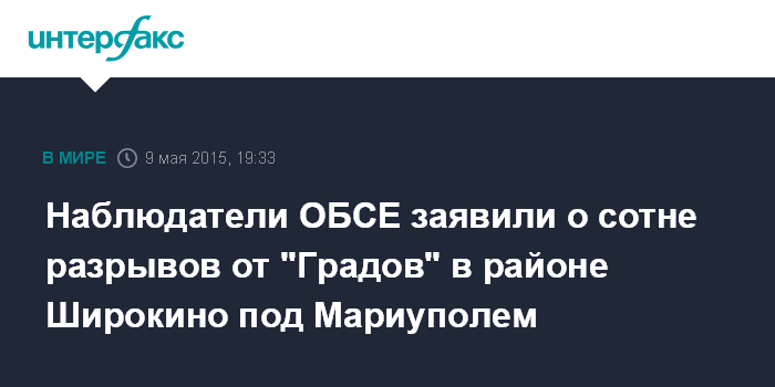 Москва. 9 мая. INTERFAX.RU - В районе н.п.Широкино (близ Мариуполя) 7 мая наблюдатели Специальной мониторинговой миссии (СММ) ОБСЕ зафиксировали массированный артиллерийский обстрел из РСЗО "Град" и обнаружили два "Града" близ контролируемого ополчением ДНР Новоазовска.