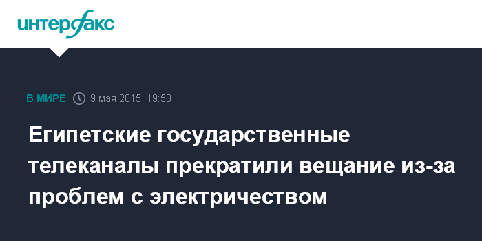 Москва. 9 мая. INTERFAX.RU - Ряд государственных телеканалов Египта приостановил вещание ввиду отключения электроэнергии, сообщает в субботу сайт межарабского телеканала "Аль-Арабийя".