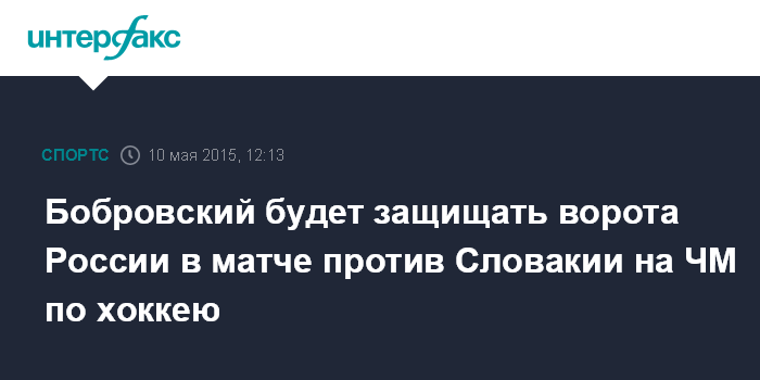 Бобровский будет защищать ворота России в матче против Словакии на ЧМ по хоккею