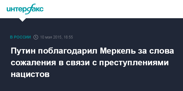 Москва. 10 мая. INTERFAX.RU - Президент России Владимир Путин выразил признательность канцлеру Германии Ангеле Меркель за сожаление в связи с преступлениями фашистской Германии в отношении граждан Советского союза.
