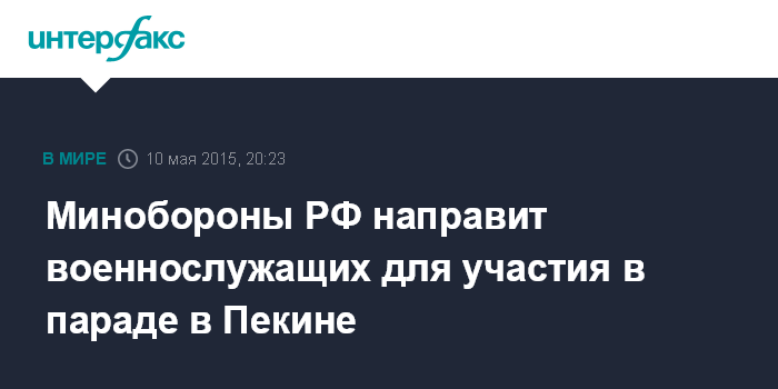 "С радостью приняли приглашение министра обороны Китайской народной республики принять участие в торжествах в Пекине по случаю 70-летия Победы во Второй мировой войне 3 сентября этого года и договорились направить на военный парад подразделение вооруженных сил Российской Федерации", - сказал Шойгу во время переговоров с заместителем председателя Центрального военного совета КНР генерал-полковником Фань Чанлуном в Москве.