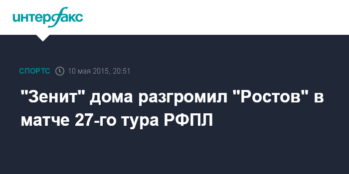 Москва. 10 мая. INTERFAX.RU - Петербургский "Зенит" дома обыграл "Ростов" в матче 27-го тура Российской футбольной премьер-лиги (РФПЛ).