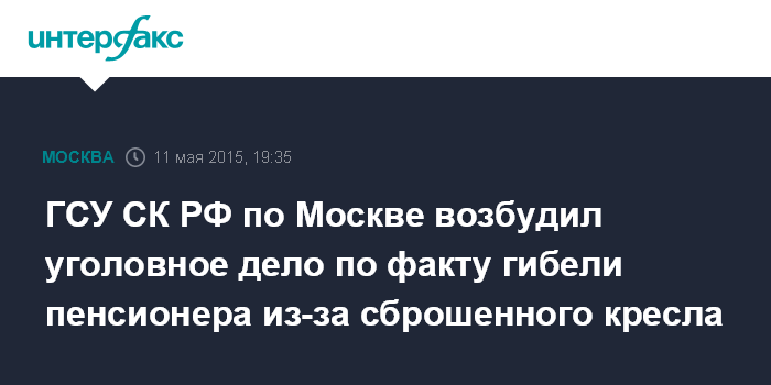 Ранее стало известно, что пенсионер убит на юго-западе Москвы сброшенным с 12 этажа креслом. По данному факту следственный комитет РФ возбудил уголовное дело. "По данным следствия, 10 мая примерно в 21:00 вблизи одного из жилых домов по улице Теплый стан обнаружено тело мужчины 1945 года рождения с открытой черепно-мозговой травмой", - сообщила "Интерфаксу" в понедельник официальный представитель ГСУ СК РФ по Москве Юлия Иванова.