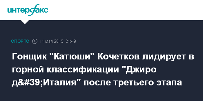 Москва. 11 мая. INTERFAX.RU - Гонщик команды "Катюша" Павел Кочетков стал лидером в классификации лучшего горного гонщика веломногодневки "Джиро д'Италия" по итогам третьего этапа, финишировавшего в Сестри Леванте.