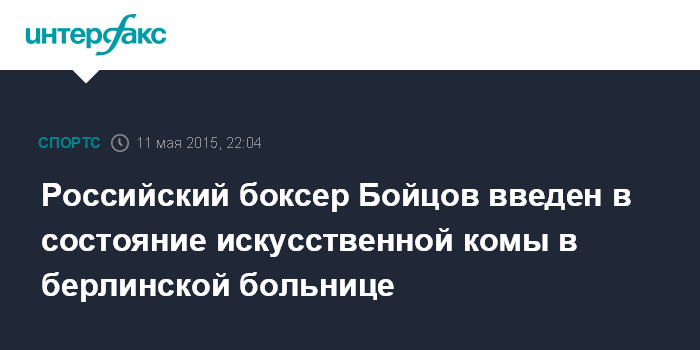 Москва. 11 мая. INTERFAX.RU - Российский боксер-тяжеловес Денис Бойцов находится в одной из берлинских больниц с тяжелыми повреждениями головы, из-за которых может завершить карьеру, сообщила газета Hamburger Abendblatt.
