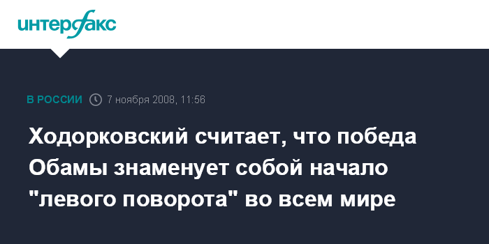 "Победа Барака Обамы на выборах президента США - это не просто очередная смена власти в одной отдельно взятой стране, пусть и сверхдержаве. Мы стоим на пороге смены парадигмы мирового развития... Впереди - левый поворот", - говорится в статье Ходорковского, опубликованной в газете "Ведомости".
