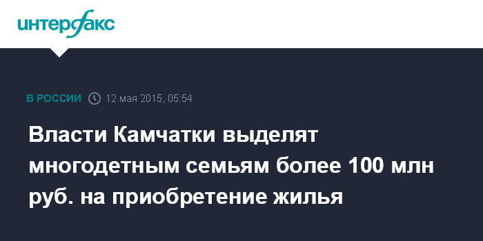 Москва. 12 мая. INTERFAX.RU - Порядка 25 многодетных семей на Камчатке получат в этом году социальную выплату на приобретение жилья, сообщает во вторник пресс-служба правительства Камчатского края.