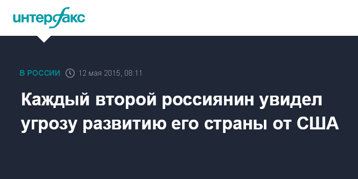 Москва. 12 мая. INTERFAX.RU - Более половины россиян видят угрозу России со стороны США, и в первую очередь в создании препятствий на пути развития нашей страны, сообщили "Интерфаксу" в "Левада-Центре".