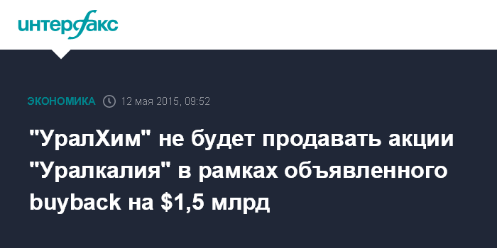 Москва. 12 мая. INTERFAX.RU - ОХК "УралХим" не планирует продавать акции "Уралкалия" в рамках объявленной калийной компанией программы buyback на сумму до $1,5 млрд, сообщил "Интерфаксу" генеральный директор "УралХима" Дмитрий Коняев.