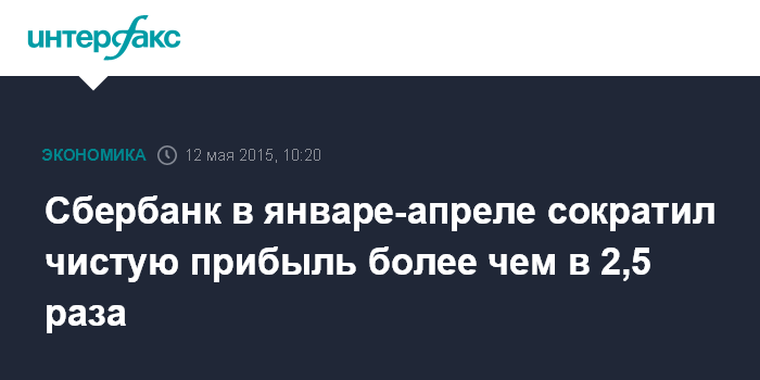 Москва. 12 мая. INTERFAX.RU - Сбербанк в январе-апреле 2015 года получил чистую прибыль по РСБУ в размере 48,8 млрд рублей против 129,8 млрд рублей за четыре месяца 2014 года, говорится в сообщении банка.