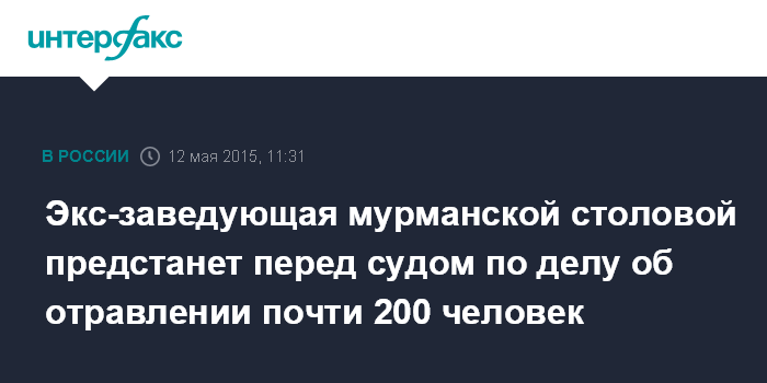 Как сообщается на сайте Генеральной прокуратуры РФ, перед судом предстанет экс-заведующая производством столовой Ловозерского ГОКа Елена Третьякова. Ей инкриминируется ч.1 ст.236 УК РФ (нарушение санитарно-эпидемиологических правил).