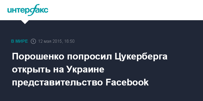 Москва. 12 мая. INTERFAX.RU - Президент Украины Петр Порошенко предлагает создателю социальной сети Facebook Марку Цукербергу открыть представительство компании на Украине.
