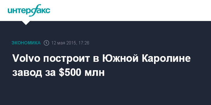 Москва. 12 мая. INTERFAX.RU - Шведский производитель автомобилей Volvo Cars Corp., владельцем которого является китайская компания, построит свой первый в США завод в штате Южная Каролина, сообщается в пресс-релизе компании.