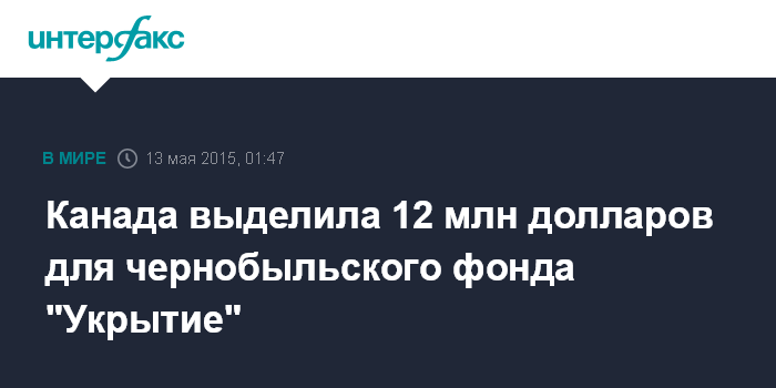 Москва. 13 мая. INTERFAX.RU - Власти Канады приняли решение внести 12 млн долларов в Международный чернобыльский фонд "Укрытие" (ЧФУ), сообщил министр иностранных дел Канады Роб Николсон.