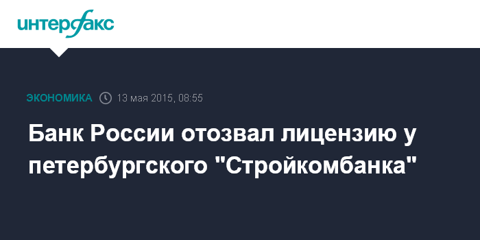 Москва. 13 мая. INTERFAX.RU - Банк России отозвал лицензию на осуществление банковских операций у кредитной организации Строительно-Коммерческий Банк (ЗАО "Стройкомбанк", рег. № 3050, г. Санкт-Петербург), сообщает пресс-служба ЦБ РФ. Лицензия отозвана с 13 мая.