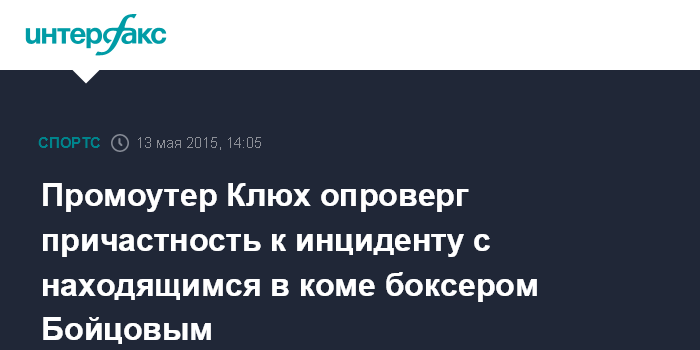 Москва. 13 мая. INTERFAX.RU - - Промоутер Вальдемар Клюх заявил, что не причастен к инциденту с российским боксером Денисом Бойцовым.