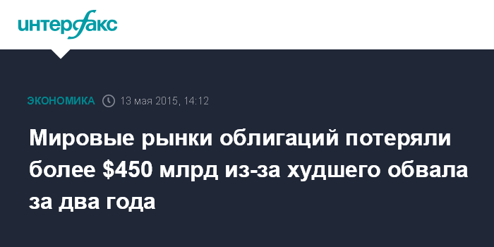 Москва. 13 мая. INTERFAX.RU - Мировые рынки ценных бумаг с фиксированным доходом несут самые значительные убытки за два года, потеряв с середины апреля свыше $450 млрд, сообщает агентство Bloomberg со ссылкой на данные Bank of America Merrill Lynch.