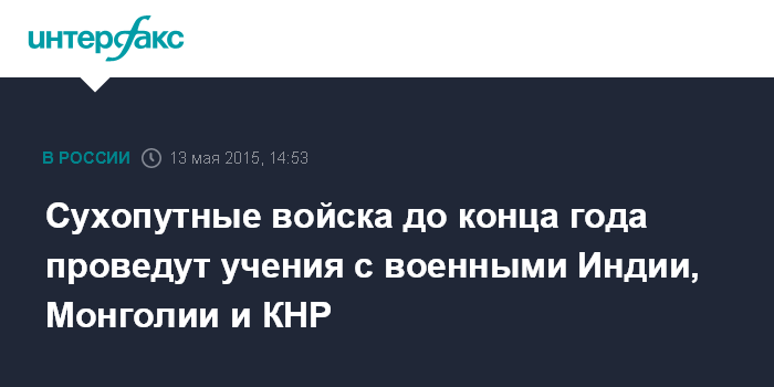 Москва. 13 мая. INTERFAX.RU - Сухопутные войска Вооруженных сил РФ во второй половине 2015 года проведут совместные военные учения миротворческой и антитеррористической направленности с подразделениями Индии, Монголии, Китая и Белоруссии.