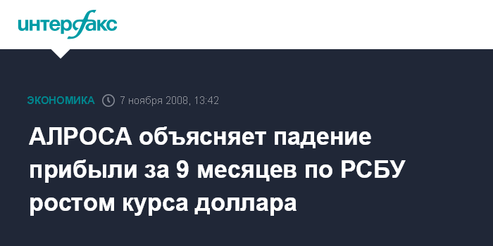 Москва. 7 ноября. INTERFAX.RU - Снижение алмазодобывающей АК "АЛРОСА" чистой прибыли по итогам 9 месяцев 2008 года было вызвано ростом курса доллара США по отношению к рублю. По словам представителя "АЛРОСА", сокращение в прошлом квартале чистой прибыли было предусмотрено компанией и заложено в бюджет. "Снижение прибыли за этот период само по себе не является неожиданным или следствием финансового кризиса - оно было предусмотрено бюджетом, который компания планировала еще в конце прошлого года", - сообщили "Интерфаксу" в компании.