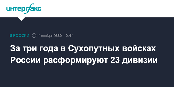 Он отметил, что в армии сохранится только одна дивизия - пулеметно-артиллерийская, которая дислоцируется на Дальнем Востоке. Численность Сухопутных войск РФ к 2012 г. сократится до 270 тысяч военнослужащих, сказал собеседник агентства.