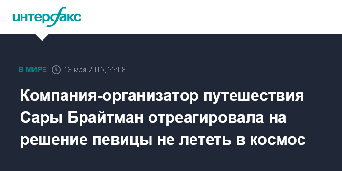 "Сара Брайтман объявила сегодня, что она откладывает свой полет на корабле "Союз ТМА-18М" 1 сентября 2015 года. По семейным обстоятельствам ее намерения изменяются, и она откладывает свою подготовку и планы на полет", - говорится в сообщении, размещенном на личном сайте певицы.