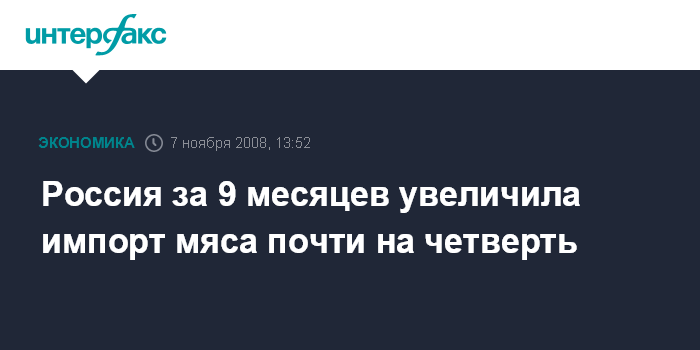 Москва. 7 ноября. INTERFAX.RU - Россия за 9 месяцев 2008 года по сравнению с соответствующим периодом прошлого года увеличила импорт мяса (кроме мяса птицы) на 23,7% в натуральном выражении.