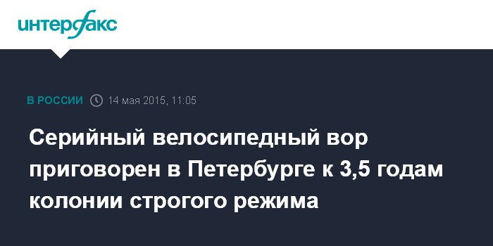Москва. 14 мая. INTERFAX.RU - Красногвардейский районный суд Санкт-Петербурга приговорил вора, специализирующегося на хищениях велосипедов, к трем с половиной годам заключения, сообщает пресс-служба городской прокуратуры в четверг.