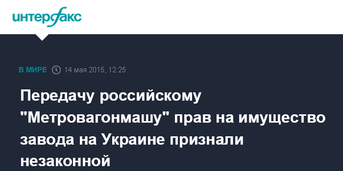 Москва. 14 мая. INTERFAX.RU - Прокуратура Черкасской области Украины доказала в суде первой инстанции незаконность передачи права собственности на имущественный комплекс Шполянского завода запасных частей российскому ОАО "Метровагонмаш" (Мытищинский машиностроительный завод).