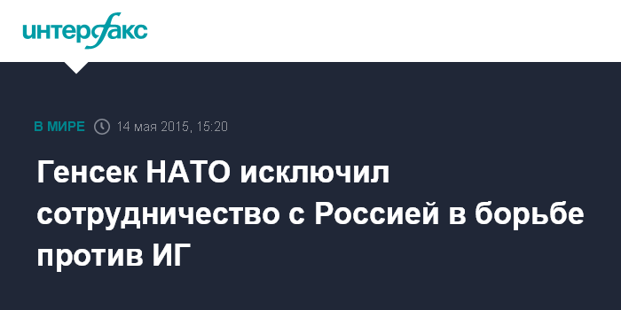 Москва. 14 мая. INTERFAX.RU - Генсек НАТО Йенс Столтенберг заявил в четверг, что не считает возможным сотрудничество между Североатлантическим альянсом и Россией в борьбе против группировки "Исламское государство".