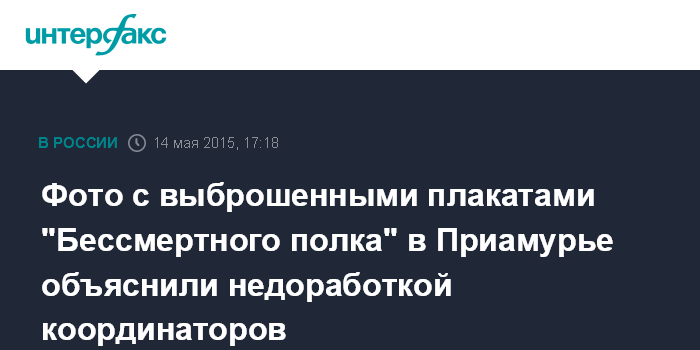 Москва. 14 мая. INTERFAX.RU - Создатели "Бессмертного полка" выяснили причину появления скандального фото с выброшенными плакатами в Комсомольске-на-Амуре, сообщил в четверг агентству "Интерфакс" председатель совета межрегионального историко-патриотического движения "Бессмертный полк" Сергей Лапенков.