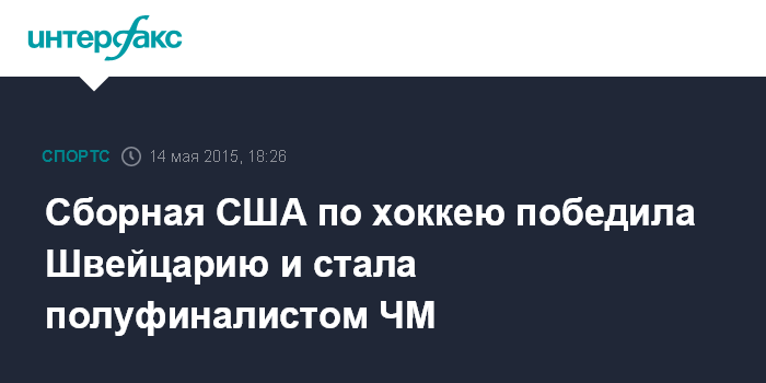 Москва. 14 мая. INTERFAX.RU - Сборная США по хоккею стала обладателем первой путевки в 1/2 финала чемпионата мира-2015.