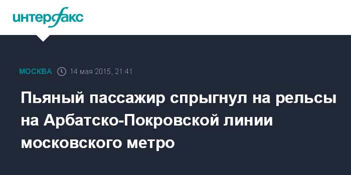 Москва. 14 мая. INTERFAX.RU - Движение поездов на Арбатско-Покровской линии московского метро приостанавливалось на 10 минут из-за пьяного пассажира, который спустился на рельсы, сообщил "Интерфаксу" в четверг источник в правоохранительных органах