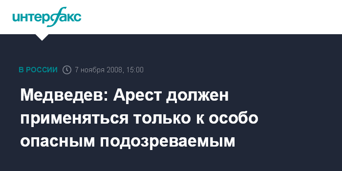 Москва. 7 ноября. INTERFAX.RU - Президент РФ Дмитрий Медведев считает, что мера пресечения в виде содержания под стражей должна применяться только для особо опасных подозреваемых.