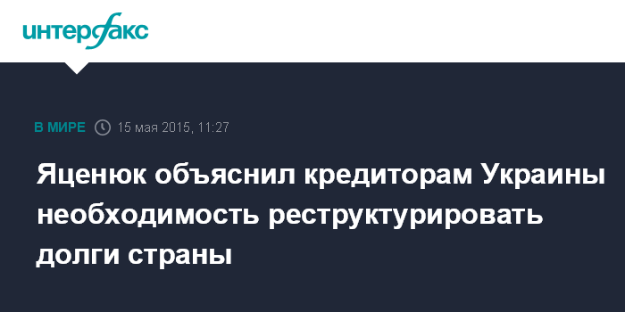 Москва. 15 мая. INTERFAX.RU - Возможность полностью обслуживать свои внешние обязательства у Украины в настоящее время отсутствует, поэтому предложение о реструктуризации долга является необходимым и правильным и кредиторам следует его принять, заявил премьер-министр Арсений Яценюк.