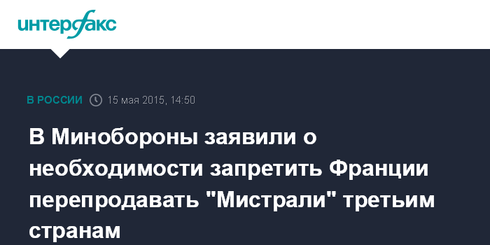 Первый корабль Франция должна была передать России в ноябре 2014 года, второй - осенью 2015 года. Однако руководство страны отказалось выполнять договорные обязательства. В мае 2015 года СМИ сообщили, что Франция может попытаться продать вертолетоносцы Китаю. При этом российский вице-премьер Дмитрий Рогозин заявил, что Франция не имеет права продавать эти "Мистрали" без согласия Москвы.